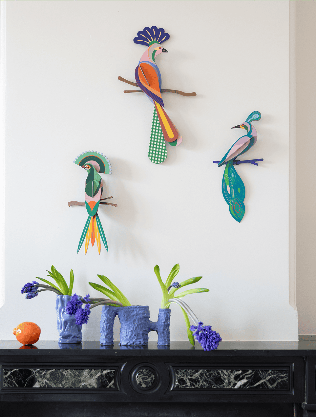 Diese Paradiesvögel aus Recyclingkarton sind eine Zierde für jedes Zimmer: unendlich farbenreich und reizvoll mit ihren auffälligen grafischen Mustern.