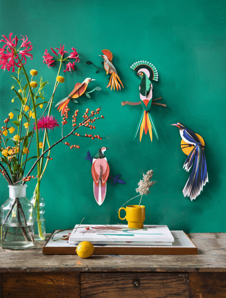 Ces oiseaux du paradis fait en carton recyclé sont des trésors pour votre maison: toujours colorés et attrayant avec leurs motifs éclatants. Pour un oiseau de paradis comme Obi, c’est comme la plus naturelle des choses de contempler son profil à chaque petit matin.
