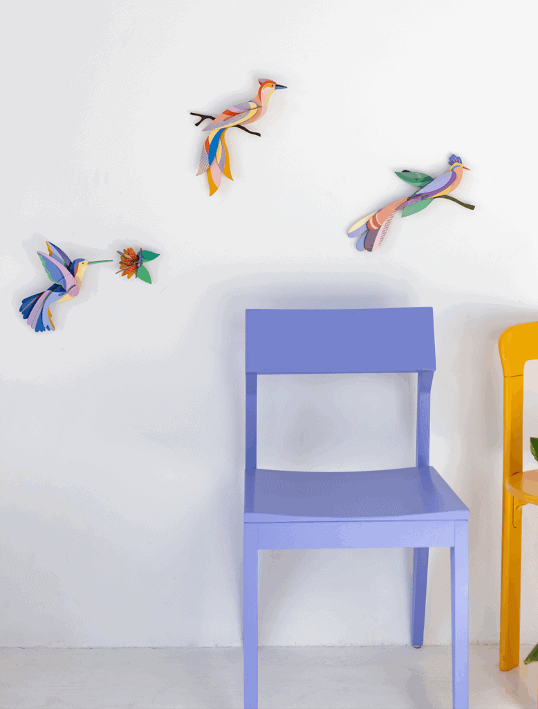 Deze paradijsvogels van gerecycled karton zijn een sieraad voor je huis: altijd even kleurrijk en verleidelijk met hun opvallende grafische dessins.