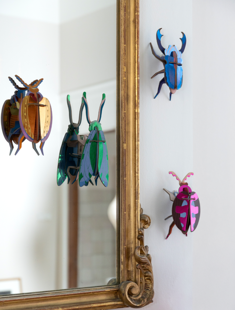 Inspired by the natural armor of beetles, this piece reveals a subtle metallic sheen. The surface catches the light softly, creating a subtle presence on the wall – bringing a touch of nature indoors.