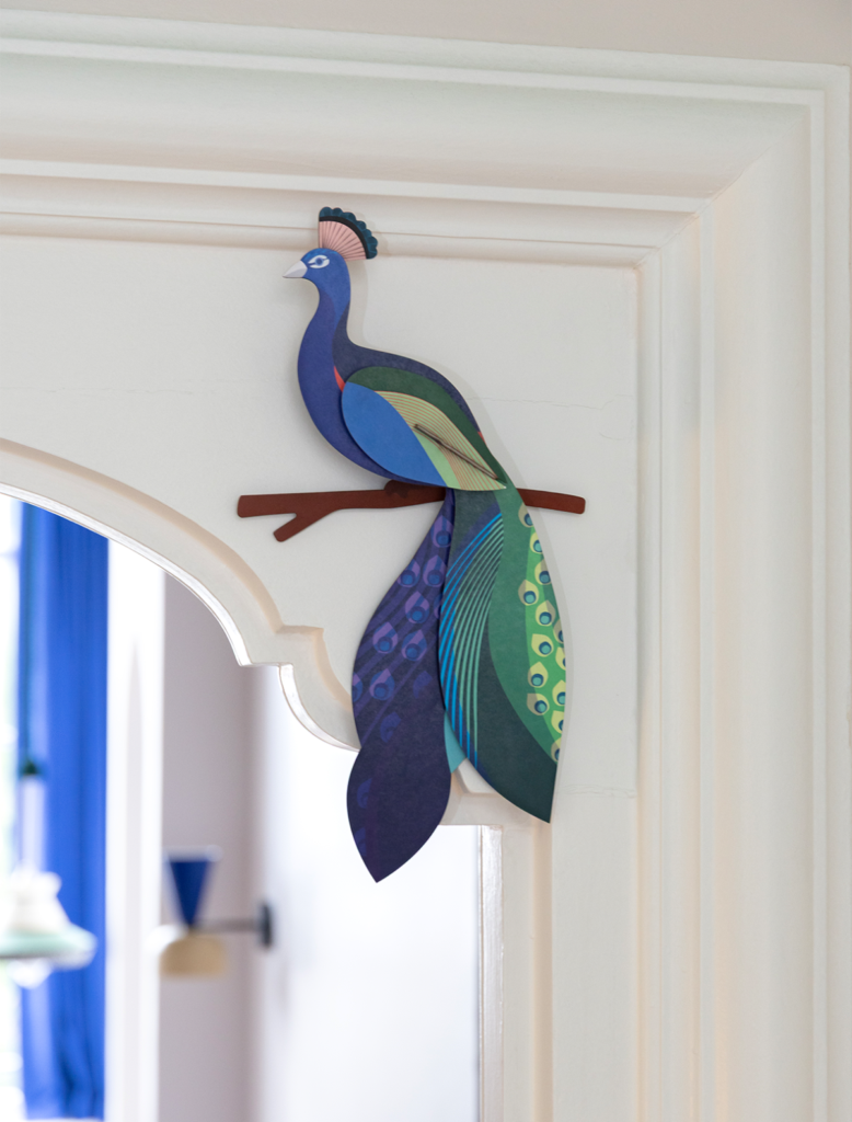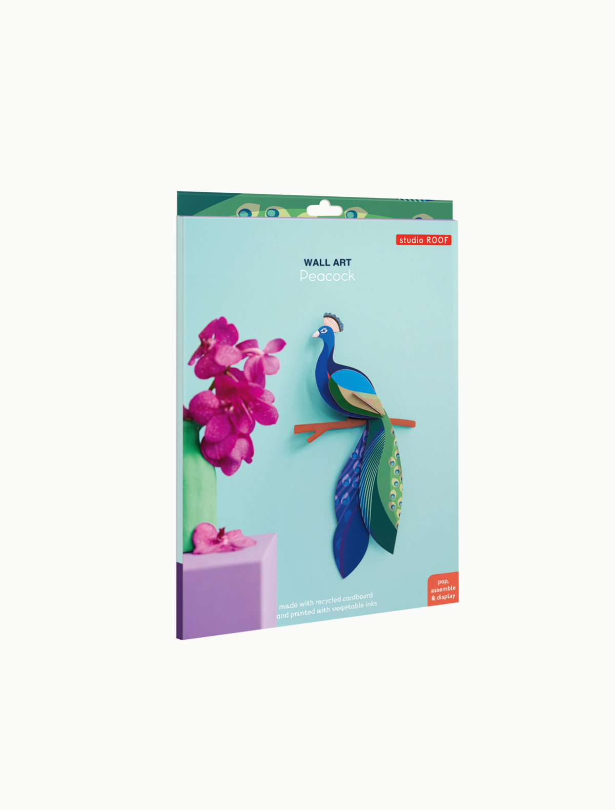 The peacock unfolds its plumage in a display of colour and pattern. Printed on recycled cardboard with vegetable inks, it brings a sense of elegance to your wall.